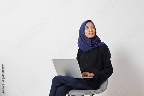 Portrait of excited Asian hijab woman in casual shirt sitting on chair, working on laptop. An employee or student doing her task and job . Businesswoman concept. Isolated image on white background