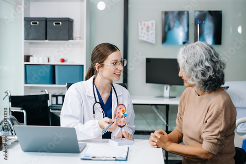 Portrait of female doctor explaining diagnosis to her patient. Doctor Meeting With Patient In Exam Room. A medical practitioner reassuring a patient in hospital