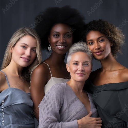 Portrait of four smiling women from different ethnic groups, with different skin tones and hairstyles, showing the natural beauty of different ages and ethnicities