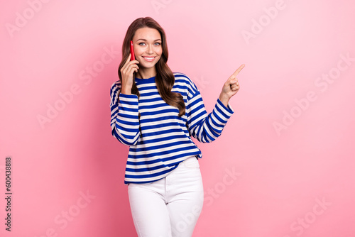 Portrait of funny adorable girl curly hairstyle striped clothes talking on phone directing empty space isolated on pink color background