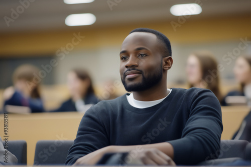portrait, young, african american, black, male, man, lecture, hall, university, college, class, education, classroom, campus, people, smiling, group, student, person, looking, face, school, lifestyle, blue, sweater, guy, sitting, friends, together, beard, photogenic, smile, casual attire, 1