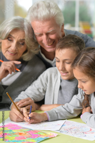 Portrait of grandparents and grandchildren drawing at home