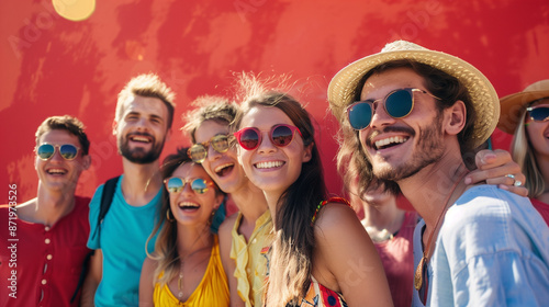 portrait, wall, colours, red wall, people, group, friends, student, young, adult, sunny day, summer, vacation, holiday, sunglasses, bright, dress, hat, smile, coiffure, smiling, laugh, hug, friendship, fun, lifestyle, happy, racked, city, sunny, standing, background, building, street, urban, modern, fashion, relax, carefree, laughing, warm, hot, party, weekend, caucasian
