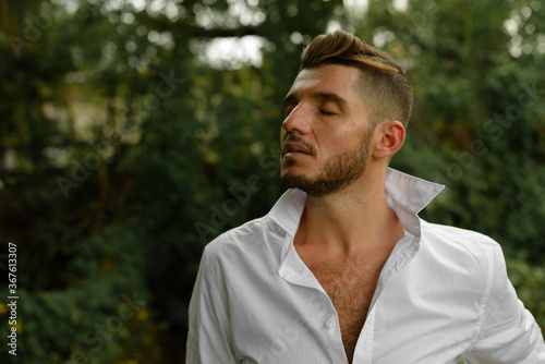 Portrait of handsome bearded Hispanic tourist man outdoors