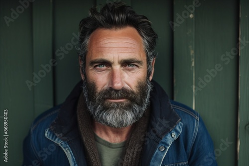 Portrait of handsome bearded man with long gray beard and mustache in denim jacket on wooden background