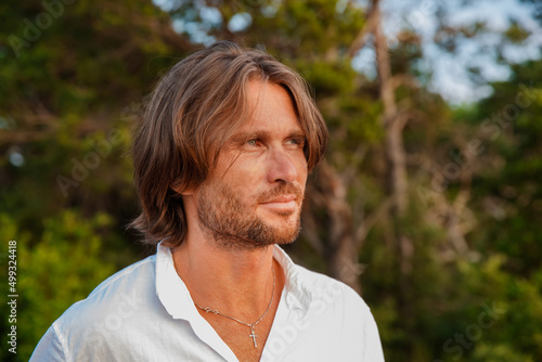 Portrait of handsome brutal man with long hair at sunset, the blue eyes, an easy bristle, he is dressed in a white shirt with a short sleeve, green trees on a background