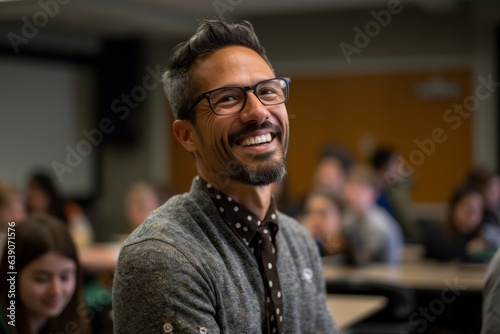 Portrait of handsome Indian man with eyeglasses at lecture hall