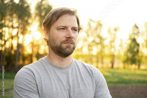 Portrait of handsome young man in gray t-shirt outdoors. Male with long hair and beard feel happy, calm and serious on Green nature sunset background. Man looking away into distance. Diversity People