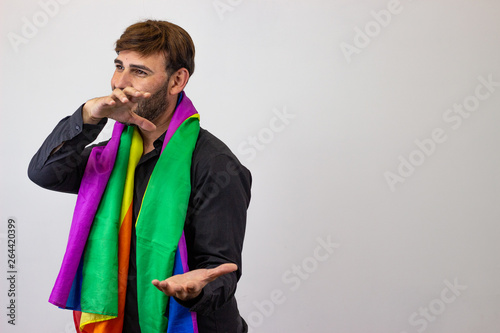 arm, background, brown hair, fashion, flag, flying, photogenic, lesbian, male, man, movement, plain, portrait, pride, rainbow, white, young
