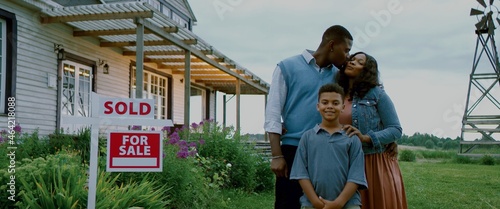 Portrait of happy African American Black family posing near sold sign, their new house in the background