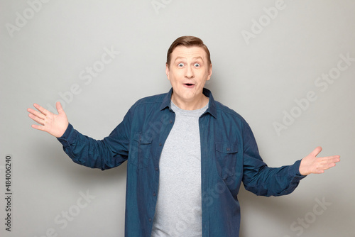 happy, surprised, man, greeting, welcome, omg, meet, shocked, guy, male, funny, wow, mature, adult, person, portrait, face, look, raise, hand, amazed, astonished, people, celebrate, overjoyed, emotional, impressed, cheerful, joyful, successful, hooray, crazy, triumph, joy, rejoice, lucky, success, amazement, caucasian, white, blond, expression, goofy, background, grey, studio, casual attire, shirt, isolated