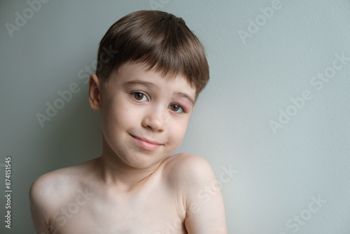 Portrait of happy beautiful joyful little 6 year boy with red swollen eye isolated on grey background. Positive kid looking at camera. Good mood. Copy space. Alive emotions. Concept of happiness
