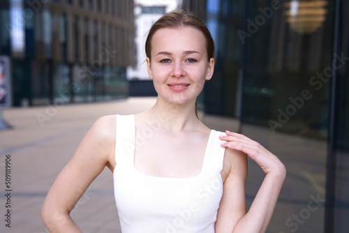 portrait of happy beautiful positive cheerful young woman, pretty teen teenager girl student is smiling standing outdoors looking at camera in top T-shirt