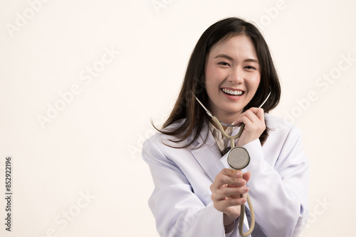 Portrait of happy female doctor wearing medical uniform and stethoscope at hospital.Beautiful smiling young asian woman doctor isolated on white background.Doctor arms crossed wear white coat.
