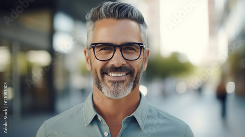 Portrait of happy mature man wearing spectacles and looking at camera outdoor. Man with beard and glasses feeling confident. Close up face of hispanic business man smiling, generative AI