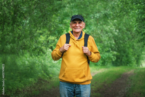 Portrait of happy senior backpacker in summer forest. Hiking and adventure concept. Sport and recreation of old people.