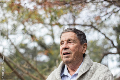 Portrait of happy senior man smiling, in the public park, outdoors. Old man relaxing outdoors and looking away. Portrait of elderly man enjoying retirement