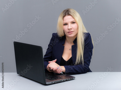 Portrait of happy smiling young cheerful businesswoman sitting with a laptop. Success in business concept studio shot talking to a client.