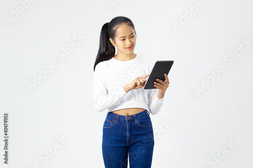 Portrait of happy young asia woman in casual clothes using tablet isolated against white background. Smiling pretty girl holding a digital tablet. Modern technologies
