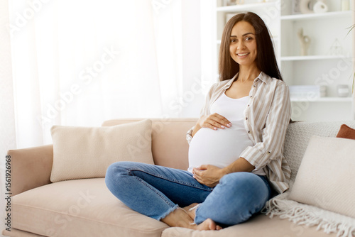 woman, female, pregnant, home, maternity, antenatal, trimester, belly, baby, bump, expecting, smile, looking, camera, joyful, care, glow, maternal, motherhood, lifestyle, parenting, cosy, casual attire, emotion, wellness, happy, hormone, balance, comfort, relaxed, mother, nurturing, domestic, style, preparation, pregnancy, positive, calm, health, serene, warmth, radiant, peaceful, love, interior, seated