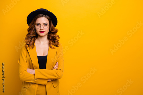 Portrait of her she nice-looking charming cute attractive lovely chic elegant serious wavy-haired lady in yellow jacket folded arms isolated on bright vivid shine orange background