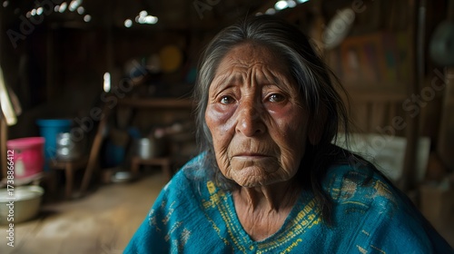woman, portrait, elderly, indigenous, wrinkle, deep, thoughtful, look, face, aged, senior, culture, traditional, clothing, turquoise, native, people, old, wise, eye, expression, human, ethnicity, closeup, indoor, home, authentic, rural, community, life, beauty, ageing, real, hope, wisdom, generation, story, serious, contemplative, cultural