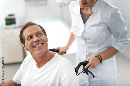 Portrait of joyful middle aged gentleman gazing at nice lady in lab coat. Hospital room on blurred background