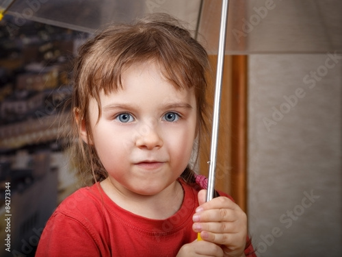 Portrait of little cute girl in red T-shirt holding an umbrella