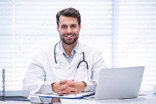 portrait, male, doctor, to sit, desk, medicals, wireless, digital, health, clinic, confidence, laboratory, communication, practitioner, professional, stethoscope, specialist, electronic, technology, profession, connection, health care, occupation, physician, workplace, expertise, clipboard, hospital, computer, cheerful, notebook, service, smile, laptop, office, tablet, smart, happy, file, coat, job