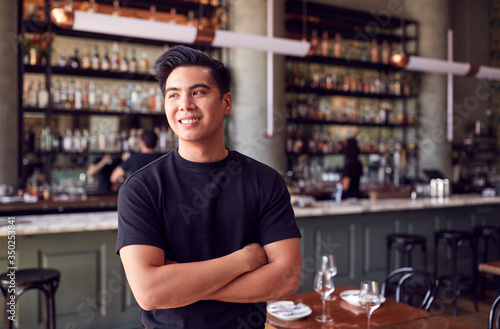 Portrait Of Male Waiter Standing In Bar Restaurant Before Service