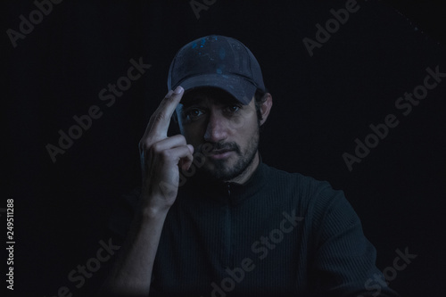 portrait, gesture, man, low, dark, key, face, expression, signs, people, person, adult, caucasian, serious, lip, guy, black, hand, background, secret, white, detail, finger, silence, mouth, casual attire, studio, beard, quiet, concept, eye, symbol, photogenic, scarey, head, facial, attitude, isolated, calm, rocker, male, dangerous, look, silent, space