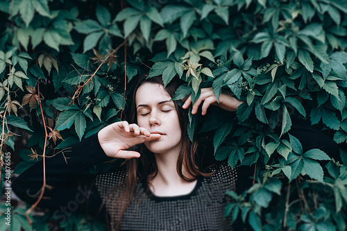 beauty, girl, fashion, green, portrait, woman, glamour, beautiful, model, skin, nature, pretty, summer, leaf, female, dark, young, sensual, hair, background, garden, lady, caucasian, cute, people, face, make-up, hand, attractive, natural, park, style, eye, fresh, adult, eye, head, person, honed, lifestyle, sexy, vogue, elegant, gorgeous, up