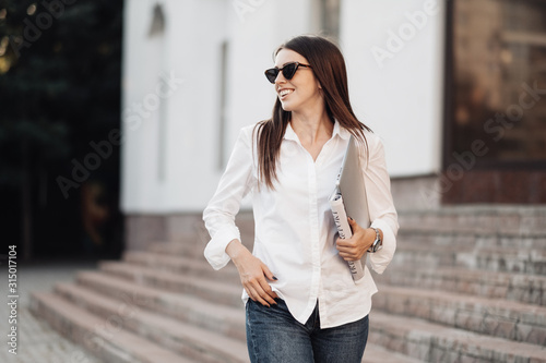 model, attractive, beautiful, female, girl, pretty, white, young, beauty, city, fashion, lifestyle, portrait, street, trendy, urban, adult, cheerful, happy, lady, fashionable, person, shirt, style, woman, glamour, business, outdoors, she, woman, stylish, 1, power, caucasian, sunglasses, jean, work, independent, freelance, mag, journal, daybook, laptop, notebook, outside, working, sunset, education, student