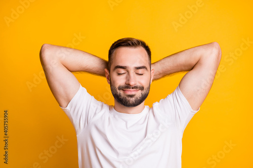 Portrait of optimistic guy lie down closed eyes wear white t-shirt isolated on vibrant yellow color background