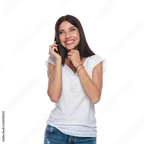 woman, female, girl, people, person, attractive, cute, sexy, pretty, beauty, beautiful, brunette, white, isolated, background, happy, smile, look, shirt, t-shirt, jean, casual attire, fashion, modern, hair, style, coiffure, joy, joyful, standing, portrait, hand, hold, phone, phone, mobile phone, mobile, talking, speaking, communication, discussion, pensive, thinking, up, side, chin