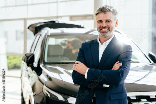 Portrait of positive smiling happy man buyer in dealership, stand happily posing next to new car, wearing formal suit. Male agent standing crossed arms in car showroom.