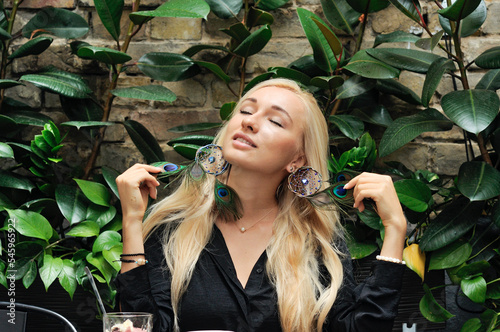 Portrait of pretty blonde girl in bohemian dreamcatcher earrings with peacock feathhemian accessories
