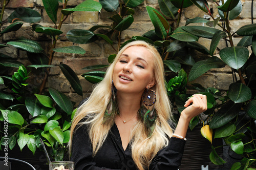 Portrait of pretty blonde girl in bohemian dreamcatcher earrings with peacock feathhemian accessories