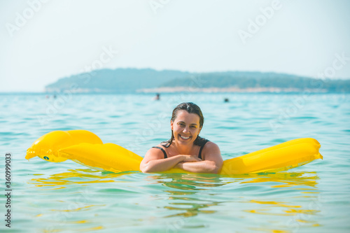 portrait of pretty smiling woman on yellow inflatable mattress