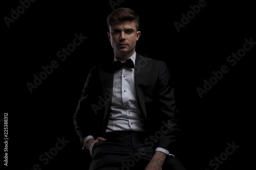 man, tuxedo, tuxedo, suit, bow tie, bow, attaching, happy, smile, attractive, formal, groom, gentleman, black, dark, shirt, white, background, business, businessman, confident, elegant, stylish, fashion, hair, style, coiffure, photogenic, look, male, young, portrait, to sit, seated, rest, relax, hand, thigh, curious