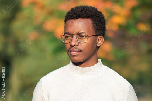 Portrait of sad serious upset pensive thoughtful black guy, young African Afro American man in glasses walking in a sunny golden autumn park at fall, thinking. Natural background.