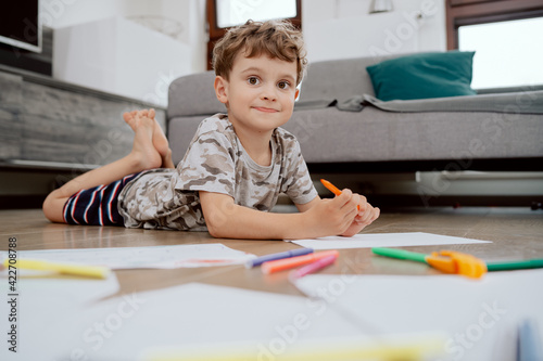 Portrait of school-age boy lies on the living room floor and paints pictures on white sheets of paper with colored markers. The boy is spending his afternoon free time at home.