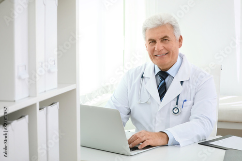 mature, white, working, patient, coat, robe, medic, desk, clinic, hospital, smart, confident, sitting, stethoscope, smiling, happy, senior, man, male, laptop, computer, technology, care, health, specialist, room, consultation, appointment, caucasian, portrait, uniform, doctor, medicals, profession, job, occupation, office, workplace, professional, work, medicine, service, business, person, adult, table, background