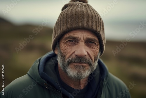 Portrait of senior man with grey beard wearing warm hat and jacket looking at camera.