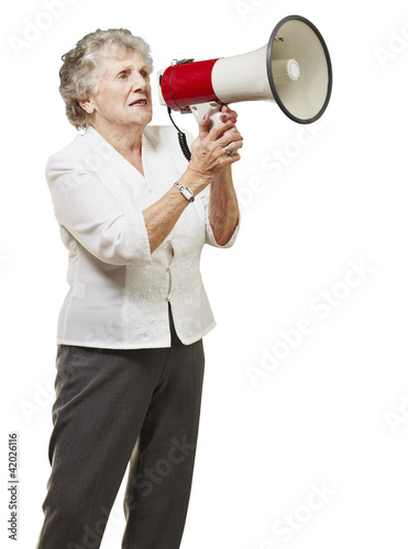 portrait of senior woman holding megaphone over white background