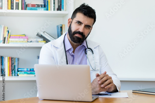Portrait of serious latin american mature doctor with hipster beard
