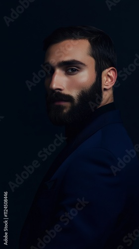 man, beard, portrait, serious, dark, background, closeup, male, face, studio, fashion, model, masculine, thoughtful, stylish