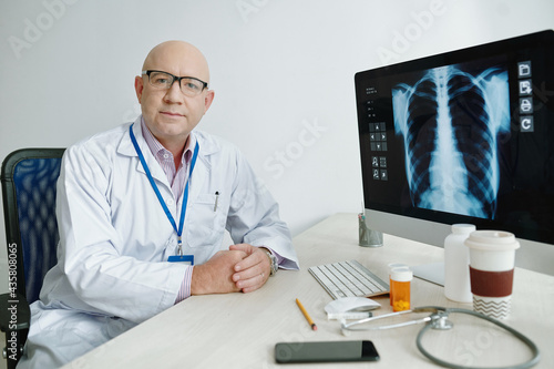 Portrait of serious mature bald doctor in lab coat sitting at desk and working with online x-ray image on computer
