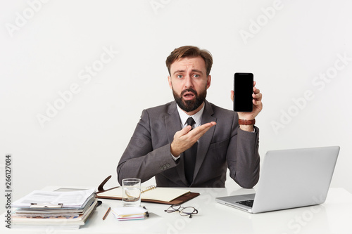 Portrait of shocked attractive bearded businessman, manager sitting at desktop in office, looking at camera in disbelief, dressed in an expensive suit with a tie, pointing to his smartphone.