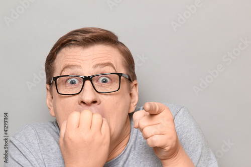 shock, man, panicking, frightened, guy, male, biting, nail, wow, fear, phobia, crazy, pointing, finger, anxious, stressful, stunned, surprise, horror, omg, mature, adult, person, fearful, horrified, scared, portrait, witness, unbelievable, grimace, face, nervous, look, excited, horrible, nightmare, people, overwhelmed, emotional, caucasian, white, expression, background, grey, studio, isolated, head shot, closeup, goggles
